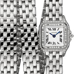 20mm x 25mm rhodiumized 18K white gold case, 6mm thick, crown set with a diamond, bezel set with brilliant-cut diamonds, sapphire crystal, silvered dial with blued-steel sword-shaped hands, quartz movement, rhodiumized 18K white gold triple loop bracelet. Water resistant to 30 meteres.