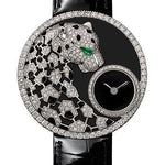 36 mm rhodiumized 18K white gold case set with 234 brilliant-cut diamonds, 8.8 mm thick, black lacquer dial with rhodiumized white gold panther motif set with 225 brilliant-cut diamonds totaling 0.58 carats, quartz movement, shiny black alligator leather strap, rhodiumized 18K white gold ardillon buckle. Water resistant to 3 bar (approx 30 meters/100 feet).