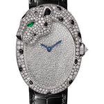 rhodiumized 18K white gold case set with 438 brilliant-cut diamonds, crown set with a brilliant-cut diamond totaling 0.20 carats, diamond-set shagreen dial (499 brilliant-cut diamonds totaling 1.19 carats), caliber 530 MC automatic movement, shiny black alligator-skin strap, ardillon buckle. Water resistant to 3 bar (approx 30 meters/100 feet).