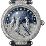 42.75 mm 18K rhodiumized white gold case set with 315 brilliant-cut diamonds, 11.75 mm thick, beaded crown set with a brilliant-cut diamond totaling 5.73 carats, 18K rhodiumized white gold dial set with 279 brilliant-cut diamonds totaling 0.99 carats, caliber 9916 MC self-winding mechanical movement, approximately 48 hours of power reserve, shiny blue alligator skin strap, 18K rhodiumized white gold double adjustable folding buckle. Water resistant to 3 bar (approx 30 meters/100 feet).