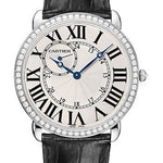 Extra large size (42mm) 18K white gold case set with round diamonds, circular-grained crown with set with a diamond, silvered flinque dial with 12 black Roman numerals, 10 black Arabic numerals, small seconds at 10 o'clock, manual winding caliber 9754 MC movement, alligator strap with 18K white gold deployant buckle. Water resistant to 30 meters.
