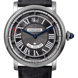 40mm 18K white gold case, 13.26mm thick, 18K white gold crown set with a blue sapphire, sapphire crystal, grey dial with blued steel-sword shaped hands, self-winding movement annual calendar complication with days indicated by a hammer-shaped hand and months by a disc, large date at 12 o'clock, approximately 48 hours of power reserve, black alligator skin strap, 18K white gold buckle with double adjustable folding. Water resistant to 30 meters.