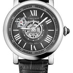 47mm niobium-titanium case, 15.5mm thick, beaded crown set with a black spinal cabochon, sapphire crystal, slate-gray galvanized dial with satin-finish sunray effect, white transferred Roman numerals, rhodiumized steel sword-shaped hands with superluminova coating, 9460 MC self-winding movement with astrotourbillon complication and carriage rotating around the dial in 1 minute, tourbillon carriage and escapement in carbon crystal requiring no regulation or lubrification, approximately 48 hours of power reserve, black alligator strap, 18K white gold double adjustable folding buckle. Water resistant to 30 meters.