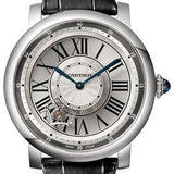47mm 18K white gold case, 15.5mm thick, circular grained crown set with a sapphire, sapphire crystal, silvered dial with guilloche silvered upper and lower dials, black transferred Roman numerals with satin-brushed sunray finish, caliber 9451MC manual movement, approximately 48 hours of power reserve, black alligator strap, double adjustable deployant buckle in 18K white gold. Water resistant to 30 meters.