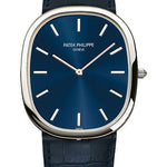 31.1mm x 35.6mm platinum case, 18K gold sunburst with Blue Gold center dial with gold applied hour markers, ultra thin self winding caliber 240 movement, approximately 48 hours of power reserve, leather strap. Water resistant to 30 meters.