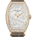 29.6 mm x 38.9 mm 18K rose gold case set with 480 diamonds (~ 3.31 ct) in a gridless setting, cambered sapphire-crystal back, hand-guilloched 18K gold dial set with 367 diamonds (~ 0.56 ct) and gold cabochon hour markers, caliber 25-21 REC manually wound movement, approximately 44 hours of power reserve, shiny taupe alligator strap with square scales, prong buckle set with 26 diamonds (~ 0.15 ct). Water resistant to 30 m.