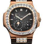 40mm 18K rose gold case set with diamonds, sapphire crystal back, screw-down crown, black dial with gold applied hour markers with luminescent coating, self-winding caliber 240 PS IRM C LU movement with power reserve, date by hand, moon phases, seconds subdial, approximately 48 hour of power reserve, leather strap with Nautilus fold-over buckle. Water resistant to 120 meters.