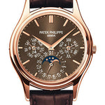 37.2mm 18K rose gold case, interchangeable full and sapphire crystal back, brown sunburst dial, self winding caliber 240 Q movement with day, date, month, moonphase, and am/pm indications, approximately 48 hour of power reserve, matt dark brown alligator strap with fold-over buckle. Water resistant to 30 meters.