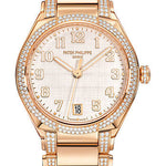 36 mm 18K rose gold case, 10.05 mm thick, sapphire-crystal back, crown set with 13 diamonds (~0.06 ct), bezel and lugs set with 208 diamonds (~1.01 ct), silvery dial with a shimmering vertical and horizontal satin finish, gold applied numerals and luminescent hour markers, caliber 324 S C self-winding movement with date in an aperture and center sweep second hand, approximately 35-45 hours of power reserve, 18K rose gold bracelet set with 248 diamonds (~0.81 ct), fold-over buckle. Water resistant to 30 m.