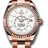 42mm 18K Everose gold case, screw-down back, screw-down crown, fluted bezel with bidirectional rotatable Rolex Ring Command, scratch-resistant sapphire crystal with cyclops lens over the date and double anti-reflective coating, white dial, index hour markers with Chromalight, Rolex calibre 9001 automatic movement , second time-zone displayed via off-center rotating disc, Saros annual calendar with date at 3 o'clock and month indicated in discrete apertures at each of the 12 hour marks, Oyster bracelet with flat three-piece links, folding Oysterclasp buckle. Waterproof to 100 meters.