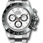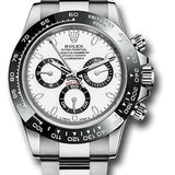 40mm polished 904L stainless steel case, screw-down back and push buttons, screw-down crown and push buttons with Triplock triple waterproofness, black monobloc ceramic Cerachrom bezel with engraved tachymetric scale, scratch-resistant sapphire crystal, white panda lacquer dial, 18K white gold applied applique hour markers with Chromalight, black snailed counters, automatic movement with chronograph central second hand, 30-minute counter at 3 o'clock, and 12-hour counter at 9 o'clock, approximately 72 hours of power reserve, 904L stainless steel Oyster bracelet with solid links, folding Oysterlock buckle with Easylink 5mm comfort extension link. Waterproof to 100 meters. The 116500 series was first introduced at the 2016 Baselworld Watch Fair.