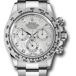 40mm 18K white gold case, screw-down back, screw-down crown and push buttons with Triplock triple waterproofness, fixed 18K white gold bezel with engraved tachymetric scale, scratch-resistant sapphire crystal, white mother of pearl dial, diamond hour markers, Rolex calibre 4130 self-winding movement with chronograph central second hand, 30-minute counter at 3 o'clock, and 12-hour counter at 9 o'clock, approximately 72 hours of power reserve, 18K white gold Oyster bracelet with flat three-piece links, folding Oysterlock buckle with Easylink 5mm comfort extension link. Waterproof to 100 meters.