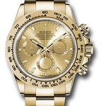 40mm 18K yellow gold case, screw-down back, screw-down crown and push buttons with Triplock triple waterproofness, fixed 18K yellow gold bezel with engraved tachymetric scale, scratch-resistant sapphire crystal, champagne dial, index hour markers, Rolex calibre 4130 self-winding movement with chronograph central second hand, 30-minute counter at 3 o'clock, and 12-hour counter at 9 o'clock, approximately 72 hours of power reserve, 18K yellow gold Oyster bracelet with flat three-piece links, folding Oysterlock buckle with Easylink 5mm comfort extension link. Waterproof to 100 meters.