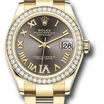 31mm 18K yellow gold case, screw-down crown with twinlock double waterproofness system, bezel set with 46 diamonds, scratch-resistant sapphire crystal with cyclops lens over the date, dark grey diamond Roman IV dial, Roman numerals with 11 diamonds set on VI, Rolex calibre 2236 automatic movement with center hour, minute and seconds hands, instantaneous date with rapid setting, and stop-seconds for precise time setting, approximately 55 hours of power reserve, 18K yellow gold Oyster bracelet with flat three-piece links, concealed folding Crownclasp buckle. Waterproof to 100 meters.