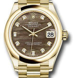 31mm 18K yellow gold case, screw-down crown with twinlock double waterproofness system, domed bezel, scratch-resistant sapphire crystal with cyclops lens over the date, dark mother-of-pearl dial, 10 diamond hour markers, Rolex calibre 2236 automatic movement with center hour, minute and seconds hands, instantaneous date with rapid setting, and stop-seconds for precise time setting, approximately 55 hours of power reserve, 18K yellow gold President bracelet with semi-circular three-piece links, concealed folding Crownclasp buckle. Waterproof to 100 meters.