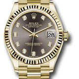 31mm 18K yellow gold case, screw-down crown with twinlock double waterproofness system, fluted bezel, scratch-resistant sapphire crystal with cyclops lens over the date, dark grey dial, 10 diamond hour markers, Rolex calibre 2236 automatic movement with center hour, minute and seconds hands, instantaneous date with rapid setting, and stop-seconds for precise time setting, approximately 55 hours of power reserve, 18K yellow gold President bracelet with semi-circular three-piece links, concealed folding Crownclasp buckle. Waterproof to 100 meters.