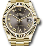 31mm 18K yellow gold case, screw-down crown with twinlock double waterproofness system, fluted bezel, scratch-resistant sapphire crystal with cyclops lens over the date, dark grey diamond Roman IV dial, Roman numerals with 11 diamonds set on VI, Rolex calibre 2236 automatic movement with center hour, minute and seconds hands, instantaneous date with rapid setting, and stop-seconds for precise time setting, approximately 55 hours of power reserve, 18K yellow gold President bracelet with semi-circular three-piece links, concealed folding Crownclasp buckle. Waterproof to 100 meters.