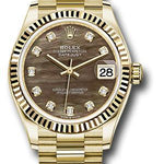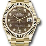 31mm 18K yellow gold case, screw-down crown with twinlock double waterproofness system, fluted bezel, scratch-resistant sapphire crystal with cyclops lens over the date, dark mother-of-pearl dial, 10 diamond hour markers, Rolex calibre 2236 automatic movement with center hour, minute and seconds hands, instantaneous date with rapid setting, and stop-seconds for precise time setting, approximately 55 hours of power reserve, 18K yellow gold President bracelet with semi-circular three-piece links, concealed folding Crownclasp buckle. Waterproof to 100 meters.