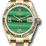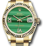 31mm 18K yellow gold case, screw-down crown with twinlock double waterproofness system, fluted bezel, scratch-resistant sapphire crystal with cyclops lens over the date, malachite diamond Roman IV and IX dial, diamonds set VI and IX, Rolex calibre 2236 automatic movement with center hour, minute and seconds hands, instantaneous date with rapid setting, and stop-seconds for precise time setting, approximately 55 hours of power reserve, 18K yellow gold Oyster bracelet with flat three-piece links, concealed folding Crownclasp buckle. Waterproof to 100 meters.