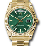Rolex Yellow Gold Day-Date 36 Watch - Fluted Bezel - Green Index Dial - President Bracelet - 118238 grip