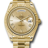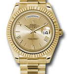 40mm 18K yellow gold case, screw-down back with Rolex fluting, screw-down crown with twinlock double waterproofness system, fluted bezel, scratch-resistant double anti-reflective sapphire crystal with cyclops lens over the date, champagne dial, Roman numerals, Rolex calibre 3255 automatic movement with centre hour, minute and seconds hands, instantaneous day and date in apertures, unrestricted rapid-setting, and stop-seconds for precise time setting, approximately 70 hours of power reserve, President bracelet with three-piece solid links comprised of a polished center link, satin-finished outer links, and ceramic inserts, concealed folding Crownclasp buckle. Waterproof to 100 meters.