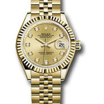28mm 18K yellow gold oyster case, screw-down crown with twinlock double waterproofness system, fluted bezel, scratch-resistant sapphire crystal with cyclops lens over the date and double anti-reflective coating, champagne dial, 10 diamond hour markers, Rolex calibre 2236 automatic movement with center hour, minute and seconds hands, instantaneous date with rapid setting, and stop-seconds for precise time setting, 18K yellow gold Jubilee bracelet with five-piece links, concealed folding Crownclasp buckle. Waterproof to 100 meters.