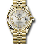 28mm 18K yellow gold oyster case, screw-down crown with twinlock double waterproofness system, fluted bezel, scratch-resistant sapphire crystal with cyclops lens over the date and double anti-reflective coating, silver dial, Roman numerals, Rolex calibre 2236 automatic movement with center hour, minute and seconds hands, instantaneous date with rapid setting, and stop-seconds for precise time setting, 18K yellow gold Jubilee bracelet with five-piece links, concealed folding Crownclasp buckle. Waterproof to 100 meters.
