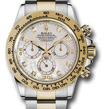 40mm Yellow Rolesor case with 904L steel monobloc middle case, screw-down steel back, screw-down crown and push buttons with Triplock triple waterproofness, fixed 18K yellow gold bezel with engraved tachymetric scale, scratch-resistant sapphire crystal, mother of pearl dial, diamond hour markers, Rolex calibre 4130 self-winding movement with chronograph central second hand, 30-minute counter at 3 o'clock, and 12-hour counter at 9 o'clock, approximately 72 hours of power reserve, 18K yellow gold Oyster bracelet with flat three-piece links made from a combination of 904L steel and 18K yellow gold, folding Oysterlock buckle with Easylink 5mm comfort extension link. Waterproof to 100 meters.