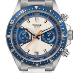 The Heritage Chrono Blue demonstrates the original shape and proportions of the TUDOR Oysterdate Chronograph from the early 1970s. Updated with modern design details, this model features an opaline and blue dial with a steel bracelet. Impressive functionality such as a dual time zone display, rotatable 12-hour graduated steel bezel and 45-minute totalizer ensure ultimate precision.