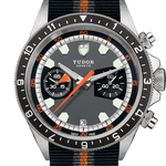 The Heritage Chrono demonstrates the original shape and proportions of the TUDOR Oysterdate Chronograph from the early 1970s. Updated with modern design details, this model features a gray and black dial with a fabric strap. Impressive functionality such as a dual time zone display, rotatable 12-hour graduated steel bezel and 45-minute totalizer ensure ultimate precision.