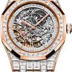 | Case Detail | 18-carat pink gold case and bezel set with baguette-cut diamonds, glareproofed sapphire crystal and caseback, screw-locked crown. |