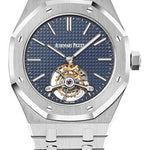 41mm x 8.85mm stainless steel case, sapphire crystal back, glareproofed sapphire crystal, blue dial with Petite Tapisserie pattern, white gold applied hour-markers, and white gold Royal Oak hands with luminescent coating , manual-winding Audemars Piguet Calibre 2924 movement with tourbillon and power reserve on back, approximately 70 hours of power reserve, stainless steel bracelet. Water resistant to 50 meters.