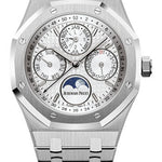41mm stainless steel case, 9.5mm thick, glareproof sapphire crystal back, screw-locked crown, glareproofed sapphire crystal, silver-toned dial with “Grande Tapisserie” pattern, white gold applied hour-markers, and Royal Oak hands with luminescent coating, Calibre 5134 perpetual calendar self-winding movement with week indication, day, date, astronomical moon, month, leap year, hours and minutes, approximately 40 hours of power reserve, stainless steel bracelet, AP folding buckle. Water resistant to 20 meters.