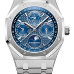 41 mm stainless steel case, 9.5 mm thick, glareproofed sapphire crystal back, screw-locked crown, glareproofed sapphire crystal, blue dial with Grande Tapisserie” pattern, white gold applied hourmarkers and Royal Oak hands with luminescent coating, blue inner bezel, Manufacture 5134 selfwinding movement with perpetual calendar with week indication, day, date, astronomical moon, month, leap year, hours and minutes, approximately 40 hours of power reserve, stainless steel bracelet, AP folding buckle. Water resistant to 20 meters.