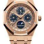 41 mm 18K pink gold case, 9.5 mm thick, sapphire crystal back, screw-locked crown, pink gold-toned dial with Grande Tapisserie pattern, blue counters, pink gold applied hour-markers and Royal Oak hands with luminescent coating, pink gold-toned inner bezel, Manufacture Calibre 5134 selfwinding movement with perpetual calendar with week indication, day, date, astronomical moon, month, leap year, hours and minutes, approximately 40 hours of power reserve, 18K pink gold bracelet, AP folding buckle , comes with additional blue alligator strap. Water resistant to 20 m.