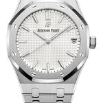 41 mm stainless steel case, 10.4 mm thick, sapphire crystal back, glareproofed sapphire crystal, silver-toned dial with Grande Tapisserie pattern, white gold applied hour-markers and Royal Oak hands with luminescent coating, Calibre 4302 selfwinding movement with hours, minutes, centre seconds and date, approximately 70 hours of power reserve, stainless steel bracelet, AP folding buckle. Water resistant to 50 m.