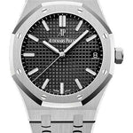 41 mm stainless steel case, 10.4 mm thick, sapphire crystal back, glareproofed sapphire crystal, black dial with Mega Tapisserie pattern, white gold applied hour-markers and Royal Oak hands with luminescent coating, Calibre 4302 selfwinding movement with hours, minutes, centre seconds and date, approximately 70 hours of power reserve, stainless steel bracelet, AP folding buckle. Water resistant to 50 m.