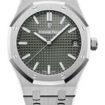 41 mm stainless steel case, 10.4 mm thick, sapphire crystal back, glareproofed sapphire crystal, slate grey dial with Grande Tapisserie pattern, white gold applied hour-markers and Royal Oak hands with luminescent coating, Calibre 4302 selfwinding movement with hours, minutes, centre seconds and date, approximately 70 hours of power reserve, stainless steel bracelet, AP folding buckle. Water resistant to 50 m.