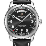 41.00 mm stainless steel case, 11.19 mm thick, screw-locked crown with two gaskets, bidirectional bezel, cambered sapphire crystal with glareproof treatment on both sides, black dial, Breitling 45 self-winding movement, approximately approx. 38 hrs of power reserve, black calfskin leather strap, folding buckle. Water resistant to 100 m (330 ft).