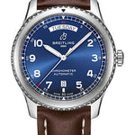 41.0 mm stainless steel case, 11.1 mm thick, screw-locked crown with two gaskets, bidirectional bezel, blue dial, Breitling 45 self-winding movement, approximately approx. 38 hrs of power reserve, brown calfskin leather strap, folding buckle. Water resistant to 100 m (330 ft).