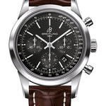 43.00 mm steel case, 14.35 mm thick, transparent sapphire crystal back, non screw-locked crown with two gaskets, convex sapphire crystal with glareproof treatment on both sides, black dial, Breitling 01 (Manufacture) self-winding movement, approximately 70 hrs of power reserve, brown croco strap, folding buckle. Water resistant to 100 m (330 ft).