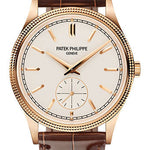 39 mm rose gold case with hand-guilloched hobnail-patteren decoration on the side, 8.08 mm thick, sapphire-crystal back, silvery grained dial with gold applied hour markers, caliber 30-255 PS manually wound movement with small seconds, approximately 65 hours of power reserve, shiny chocolate brown alligator strap, prong buckle. Water resistant to 30 m.