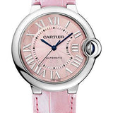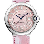 36mm stainless steel case, 12 .05mm thick, stainless steel fluted crown set with a blue synthetic spinel cabochon, sapphire crystal, pink dial with Roman numerals and blued-steel sword-shaped hands, automatic movement, pink alligator skin strap, double adjustable folding buckle. Water resistant to 30 meters.