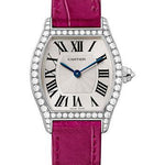 30mm x 24mm 18K rhodium-finish white gold case brilliant-cut diamonds, 7.3mm thick, steel back, octagonal crown set with a brilliant-cut diamond, 18K rhodium-finish white gold bezel set with a brilliant-cut diamonds, silver dial with sunray effect flinque, manual-winding movement with sword-shaped hands in blued steel, mineral glass, fuchsia-pink alligator skin strap. Water resistant to 30 meters.