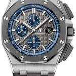 44 mm titanium case, 14.4 mm thick, glareproofed sapphire crystal back, titanium bezel and push pieces, glareproofed sapphire crystal, grey dial with Mega Tapisserie pattern, blue counters and blue external zone, white gold applied hour-markers and Royal Oak hands with luminescent coating, blue inner bezel, Calibre 3126/3840 selfwinding movement with chronograph, hours, minutes, small seconds, date, approximately 50 hours of power reserve, grey rubber strap, titanium pin buckle. Water resistant to 100 m.