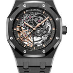 41 mm black ceramic case, 9.7 mm thick, glareproofed sapphire crystal back, glareproofed sapphire crystal, openworked slate grey dial with pink gold applied hour-markers and Royal Oak hands with luminescent coating, Calibre 3132 self-winding movement with hours, minutes, center seconds, approximately 45 hours of power reserve, black ceramic bracelet, AP folding buckle. Water resistant to 50 m.