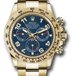 40mm 18K yellow gold case, screw-down back, screw-down crown and push buttons with Triplock triple waterproofness, fixed 18K yellow gold bezel with engraved tachymetric scale, scratch-resistant sapphire crystal, blue dial, Arabic numerals, Rolex calibre 4130 self-winding movement with chronograph central second hand, 30-minute counter at 3 o'clock, and 12-hour counter at 9 o'clock, approximately 72 hours of power reserve, 18K yellow gold Oyster bracelet with flat three-piece links, folding Oysterlock buckle with Easylink 5mm comfort extension link. Waterproof to 100 meters.