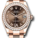 31mm 18K Everose gold case, screw-down crown with twinlock double waterproofness system, bezel set with 46 diamonds, scratch-resistant sapphire crystal with cyclops lens over the date, chocolate diamond Roman IV dial, Roman numerals with 11 diamonds set on VI, Rolex calibre 2236 automatic movement with center hour, minute and seconds hands, instantaneous date with rapid setting, and stop-seconds for precise time setting, approximately 55 hours of power reserve, 18K Everose gold Oyster bracelet with flat three-piece links, concealed folding Crownclasp buckle. Waterproof to 100 meters. Baselworld 2019 release.