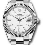 41mm white Rolesor case comprised of a 904L steel monobloc middle case, screw-down steel back, screw-down crown with twinlock double waterproofness system, 18K white gold fluted bezel, scratch-resistant double anti-reflective sapphire crystal with cyclops lens over the date, white dial, index hour markers, Rolex calibre 3235 perpetual self-winding movement with date at 3 o'clock that changes instantaneously at midnight in a few thousandths of a second, approximately 70 hours of power reserve, 904L steel Oyster bracelet with flat three-piece links, folding Oysterclasp buckle with Easylink 5mm comfort extension link. Waterproof to 100 meters.