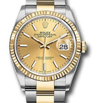 36mm yellow Rolesor case with Oystersteel monobloc middle case, screw-down steel back, screw-down 18K yellow crown, 18K yellow fluted bezel, champagne dial, index hour markers with Chromalight, Rolex calibre 3235 self-winding movement with date at 3 o'clock, approximately 70 hours of power reserve, yellow Rolesor Oyster bracelet with flat three-piece links, folding Oysterclasp buckle with Easylink 5mm comfort extension link. Waterproof to 100 meters. Redesigned for Baselworld 2018 with updated case sides, lugs, and calibre 3235 movement.
